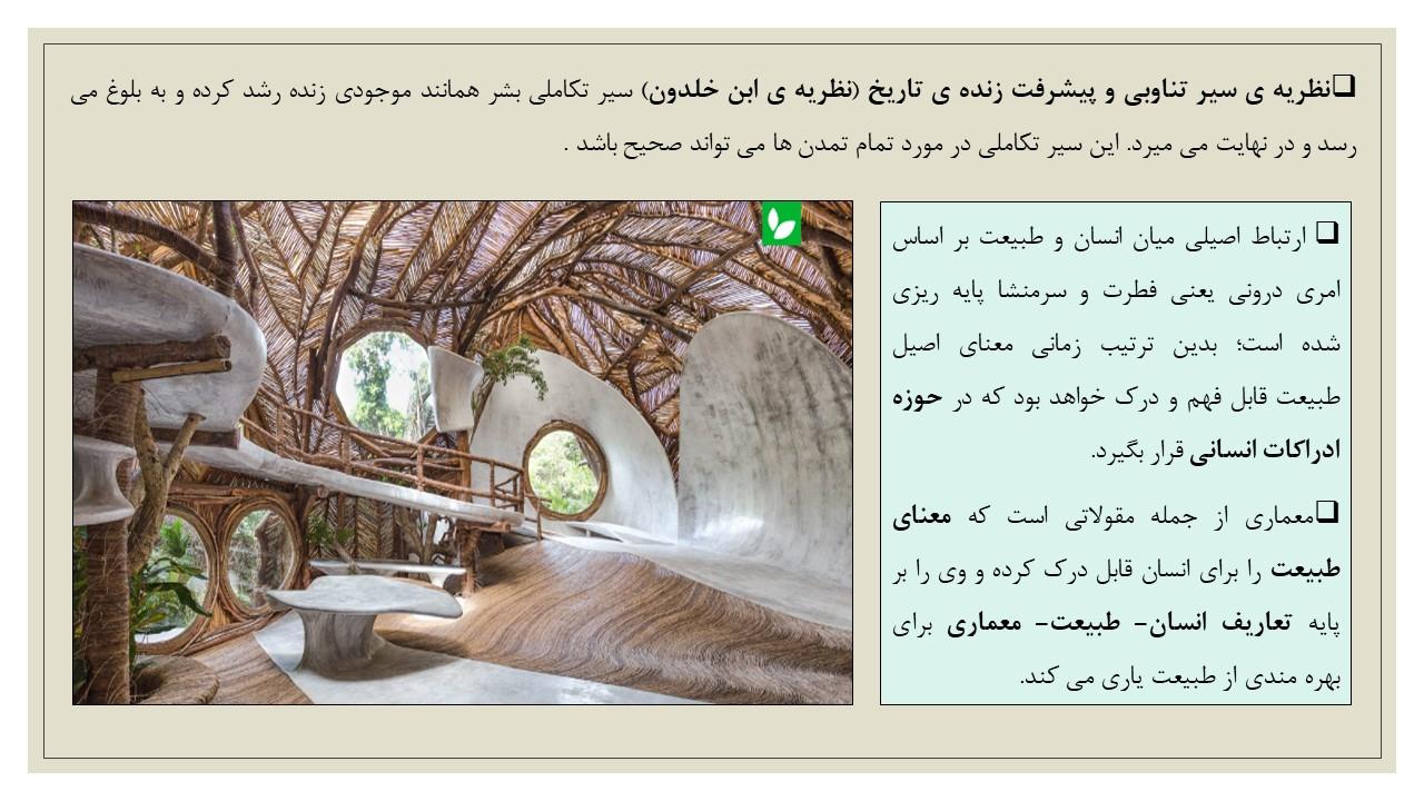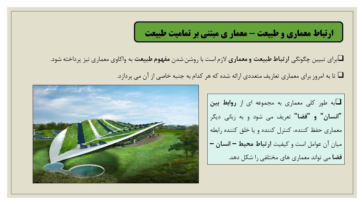 معماری از جمله مقولاتی است که معنای طبیعت را برای انسان قابل درک کرده و وی را بر پایه تعاریف انسان- طبیعت- معماری برای بهره مندی از طبیعت یاری می کند.