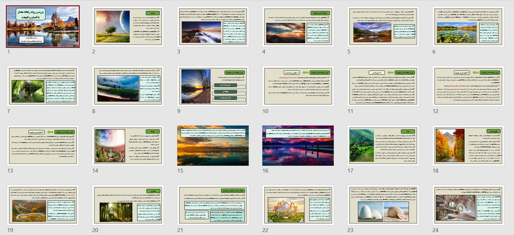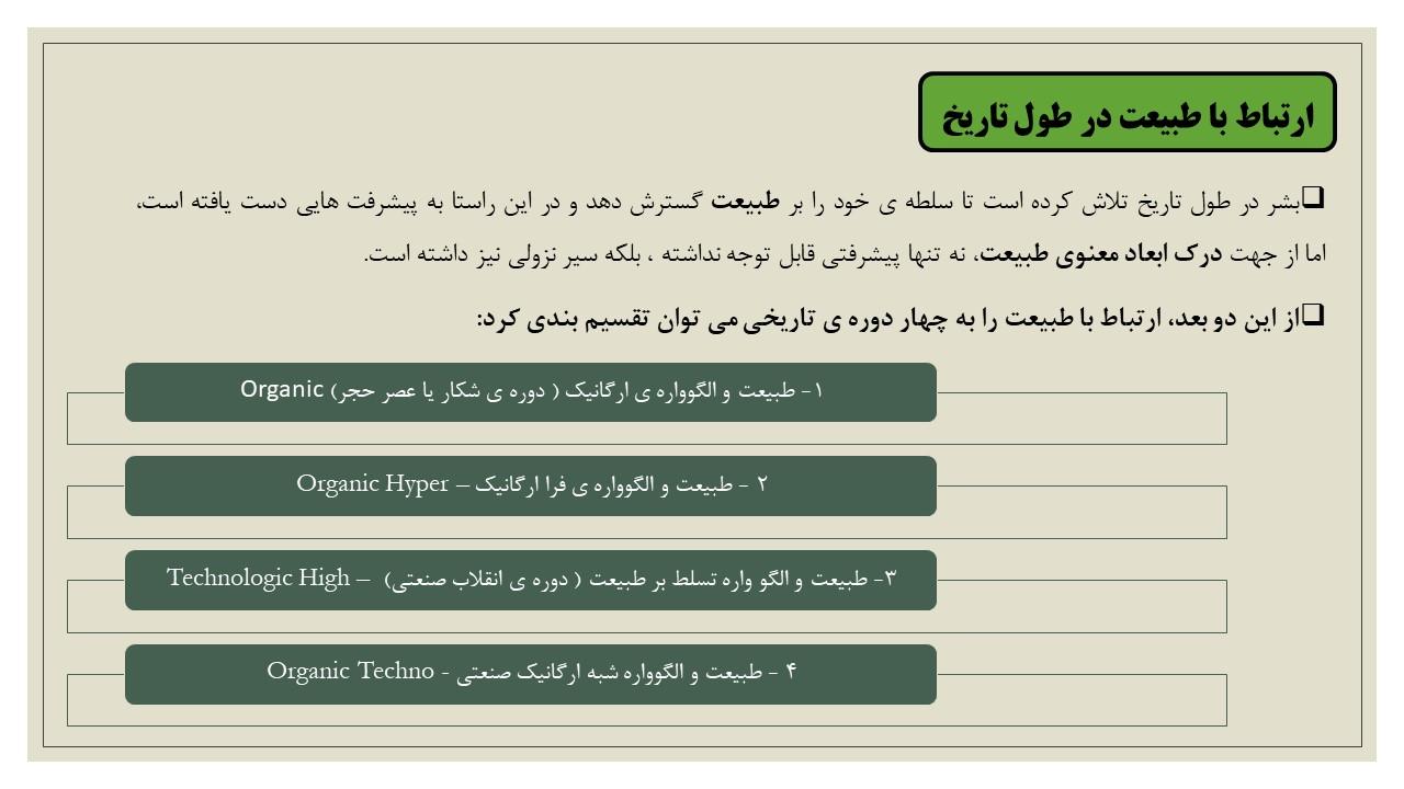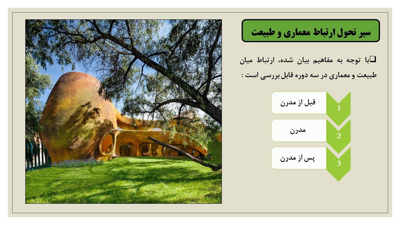 ارتباط میان نوع نگاه انسان به طبیعت با محتوای معماری ساخته شده، به روشنی نمایان بوده و نیازمند بررسی است. در مجموع می توان عنوان کرد که محتوای معماری موضوعی بنیادین است که وظیفه تدبیر فرم و ماده معماری را بر عهده دارد. جایگاه آن در معماری همانند جایگاه سرمنشا در تفسیر طبیعت بوده و زمانی که خالق اثر هنری به دنبال هماهنگی با طبیعت باشد ، باید به ارتباط محتوا با این معنی از طبیعت بپردازد تا آن چه که خلق می کند جزئی از طبیعت باشد ، همان گونه که خوِد انسان در این تفکر جزئی از طبیعت شناخته می شود. بنابراین برای شناخت کیفیت ارتباط معماری و طبیعت لازم است تا سیر تحول رابطه انسان و طبیعت نیز بررسی گردد .