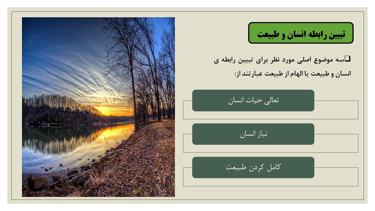 سه موضوع اصلی مورد نظر برای تبیین رابطه ی انسان و طبیعت یا الهام از طبیعت عبارتند از: