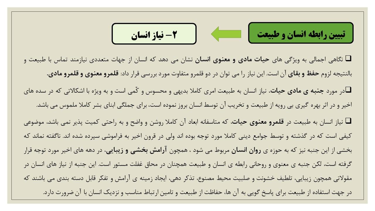 انسان بدون بهره گیری و استفاده از منابع طبیعی امکان حیات و زندگی نخواهد داشت. نیاز انسان به طبیعت و عناصر طبیعی امری کاملا مشخص شده و محسوس است، که با توجه به معضلاتی که در قرن اخیر، در اثر بهره گیری بی رویه از طبیعت و محیط توسط انسان به وجود آمده است، برای همه انسان ها ملموس می باشد.