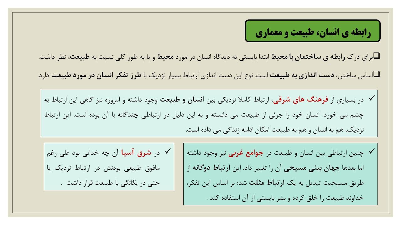 انسان با طبیعت زیسته و می زید و در عین حال برای حیات بهتر خویش در آن معماری می کند. در واقع در رابطه تثلیت انسان و طبیعت و معماری است که درک چگونگی استفاده از طبیعت در ساخت محیط های انسان ساخت خود را جلوه می دهد.