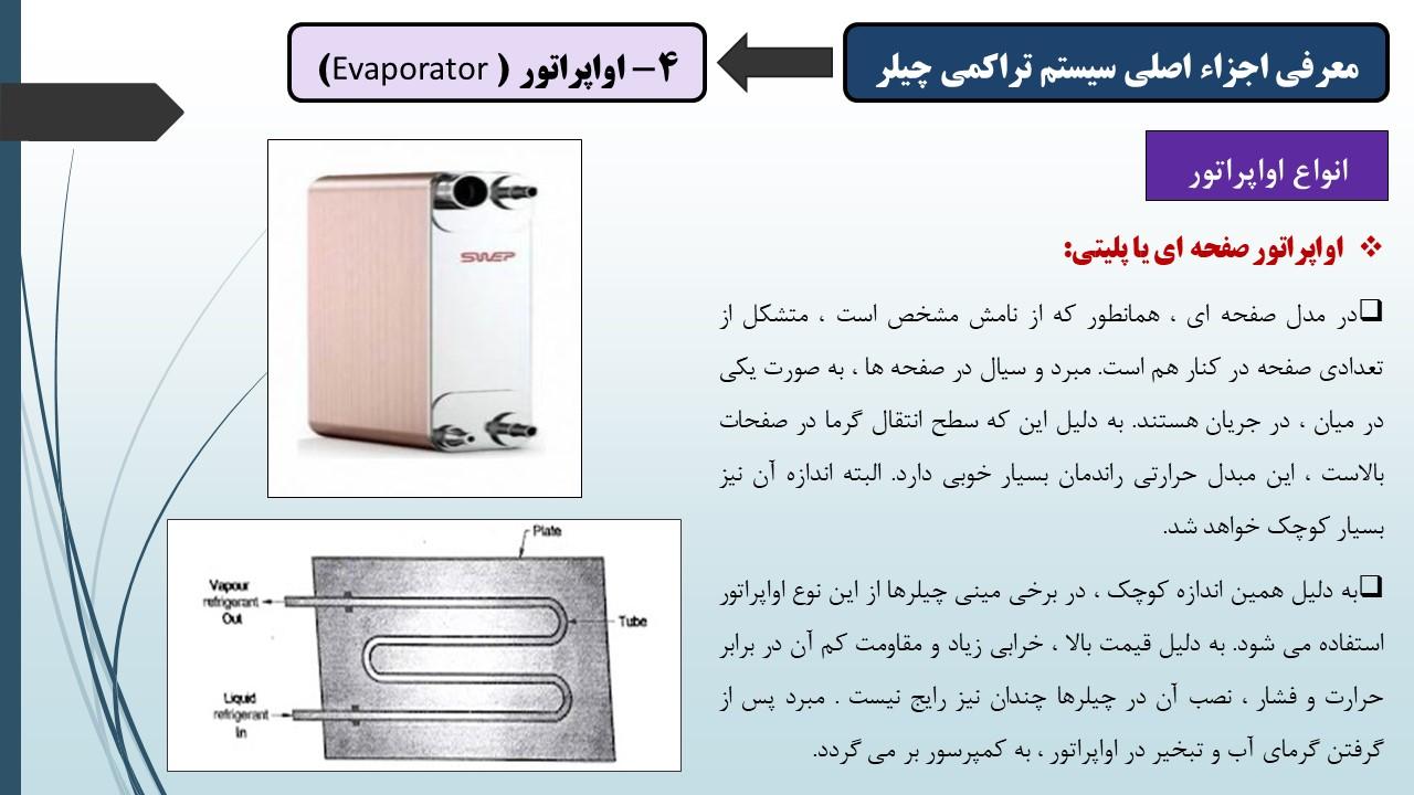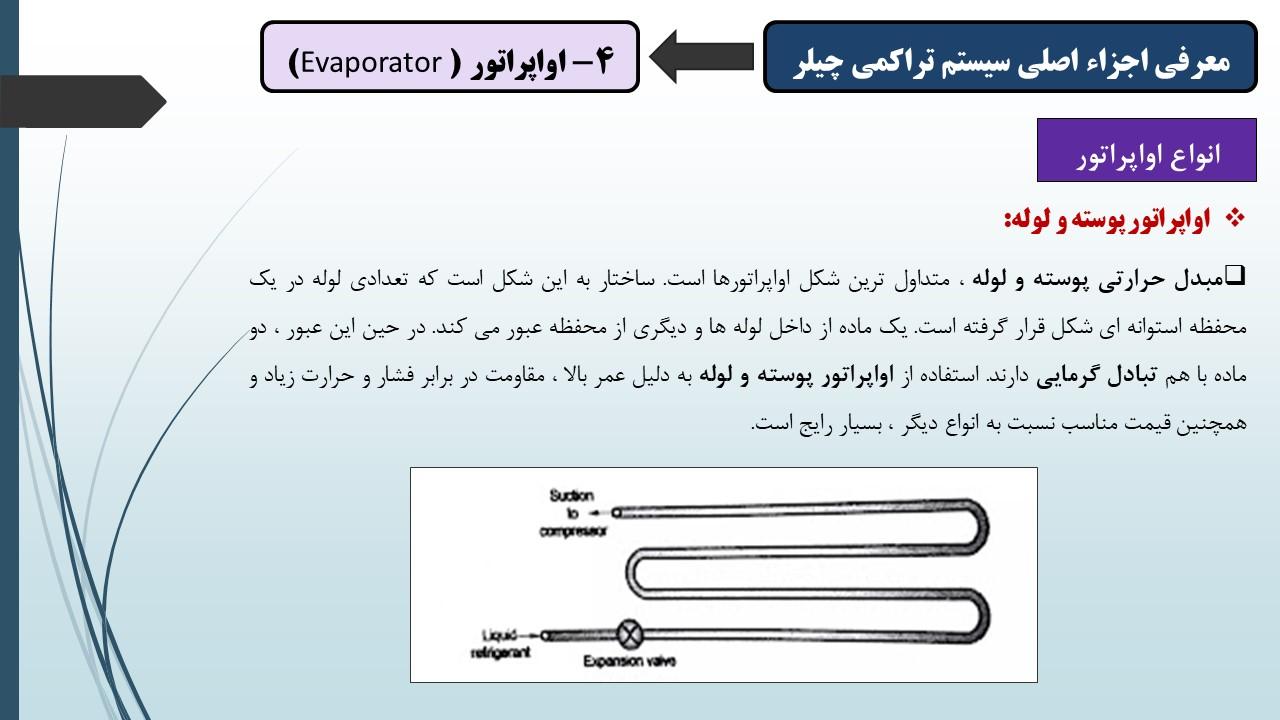 اواپراتور (تبخيركننده ) مبدلي است از نوع (Shell & Tube پوسته – لوله ) كه در آن سيال مبرد در داخل لوله هاي مسي حرارت لازم را جهت تبخير از آبي كه در داخل پوسته فولادي و اطراف لوله ها در حركت است گرفته و در نتيجه باعث سرد شدن آن مي گردد. به منظور افزايش ضريب انتقال حرارت تمهيدات زير در اواپراتور در نظر گرفته مي شود : ( انواع ديگري از اواپراتور نظير مبدل صفحه اي plate heat exchanger نيز در اين صنعت مورد استفاده دارد)