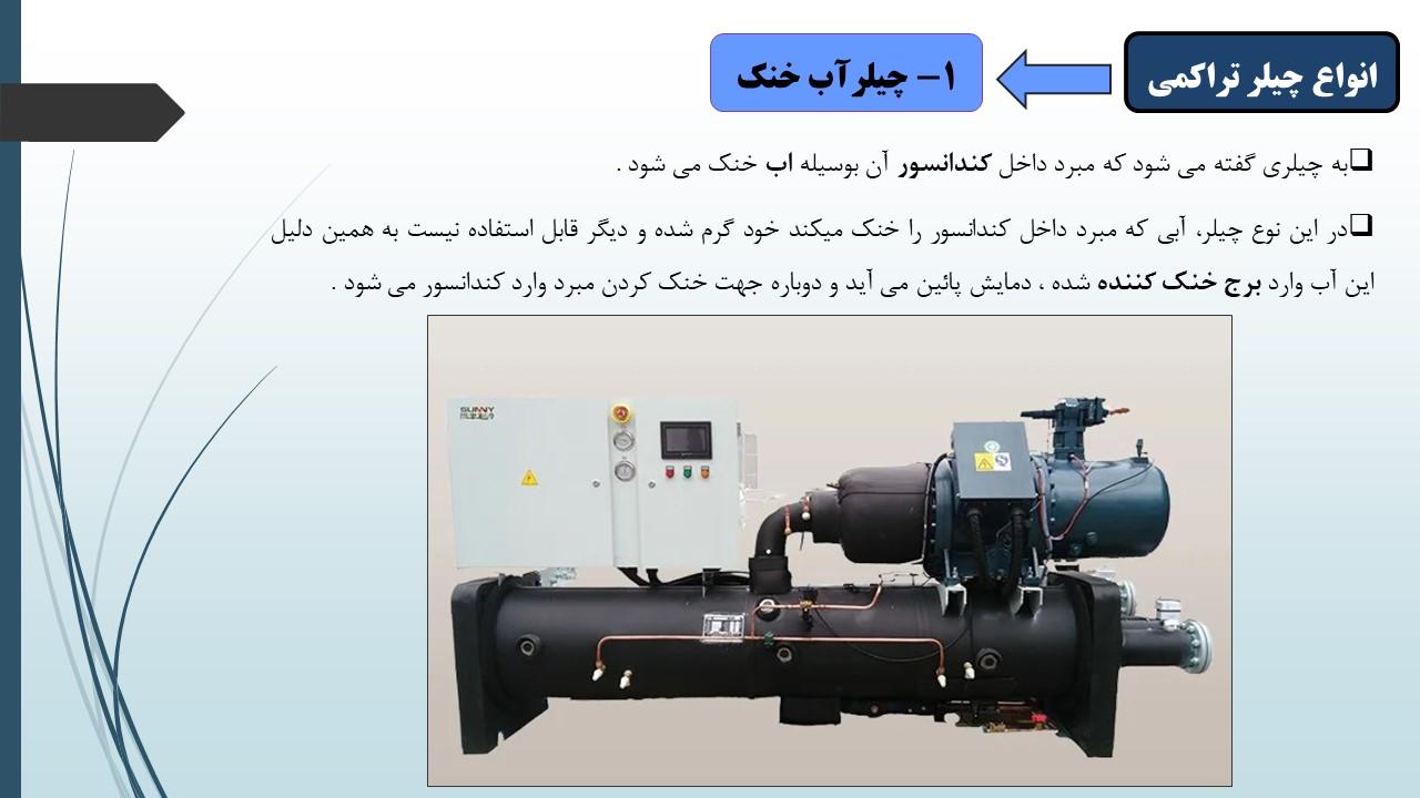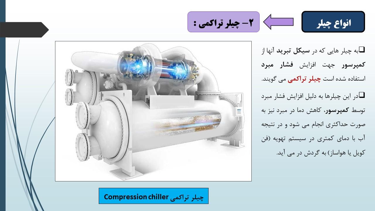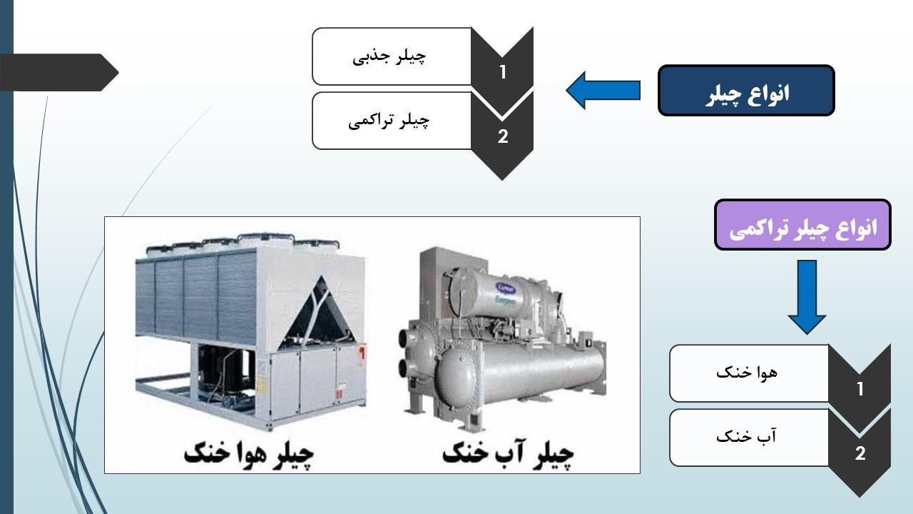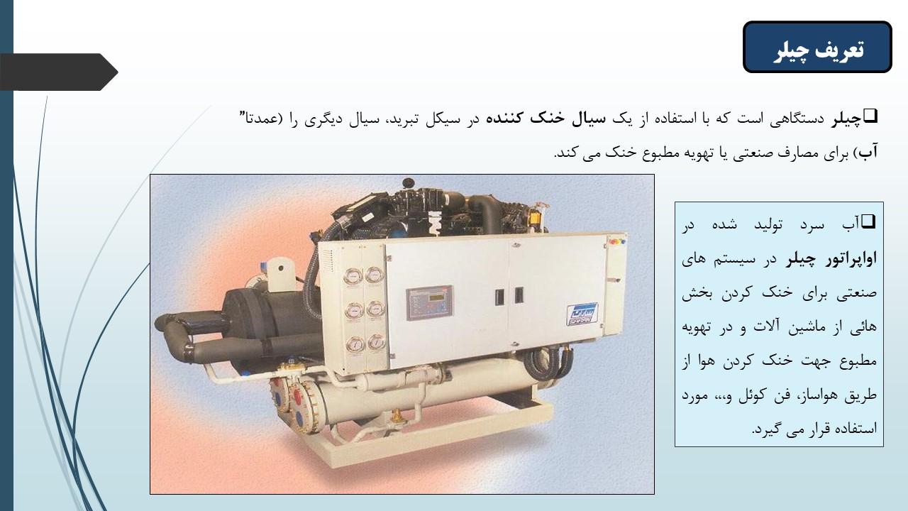 چيلر دستگاهي است كه با استفاده از يك سيال خنك كننده در سيكل تبريد، سيال ديگري را (عمدتا” آب) براي مصارف صنعتي يا تهويه مطبوع خنك مي كند. آب سرد توليد شده در اواپراتور چيلر در سيستم هاي صنعتي براي خنك كردن بخش هائي از ماشين آلات و در تهويه مطبوع جهت خنك كردن هوا از طريق هواساز، فن كوئل و،،، مورد استفاده قرار مي گيرد.