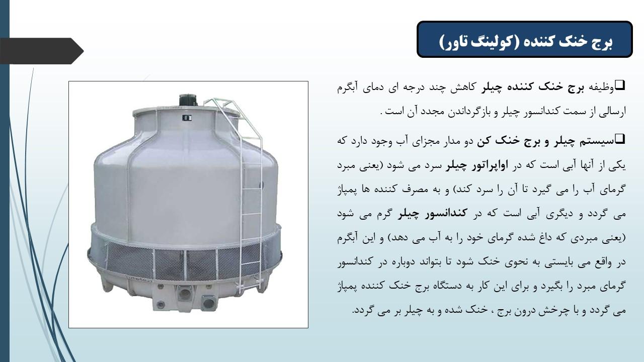 وظیفه برج خنک کننده چیلر کاهش چند درجه ای دمای آبگرم ارسالی از سمت کندانسور چیلر و بازگرداندن مجدد آن است .