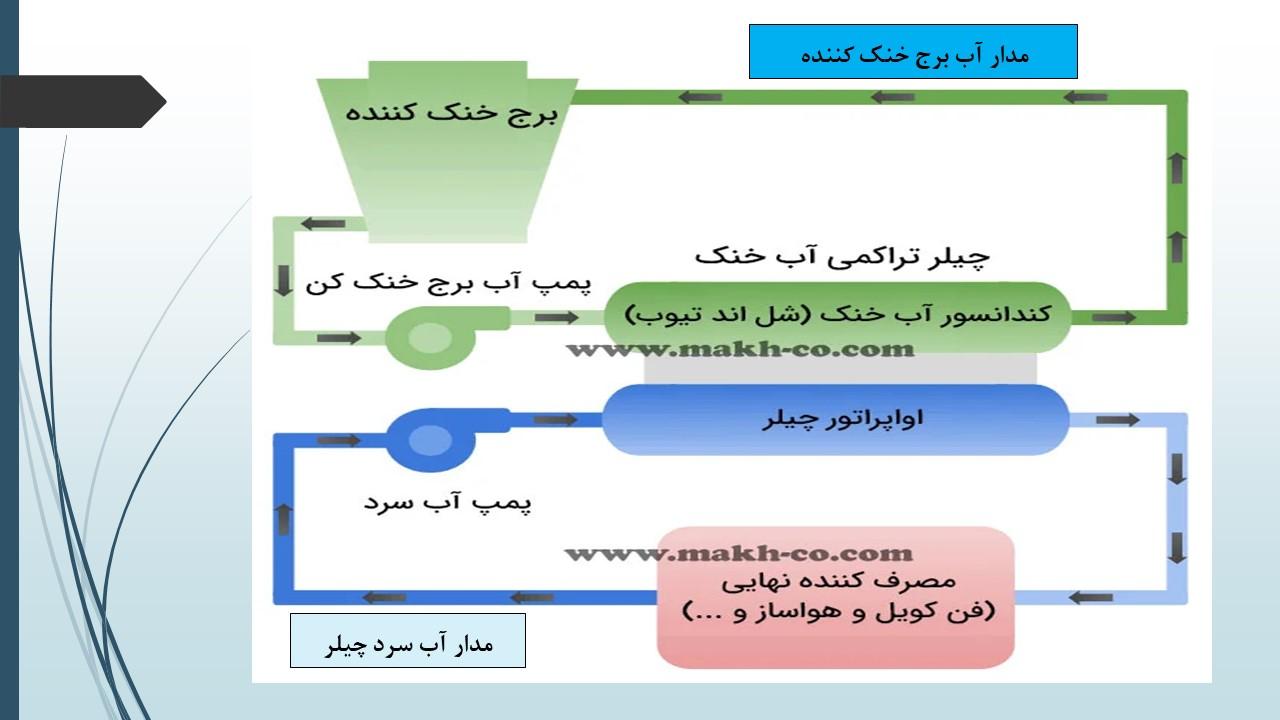 سیستم چیلر و برج خنک کن دو مدار مجزای آب وجود دارد که یکی از آنها آبی است که در اواپراتور چیلر سرد می شود (یعنی مبرد گرمای آب را می گیرد تا آن را سرد کند) و به مصرف کننده ها پمپاژ می گردد و دیگری آبی است که در کندانسور چیلر گرم می شود (یعنی مبردی که داغ شده گرمای خود را به آب می دهد) و این آبگرم در واقع می بایستی به نحوی خنک شود تا بتواند دوباره در کندانسور گرمای مبرد را بگیرد و برای این کار به دستگاه برج خنک کننده پمپاژ می گردد و با چرخش درون برج ، خنک شده و به چیلر بر می گردد.
