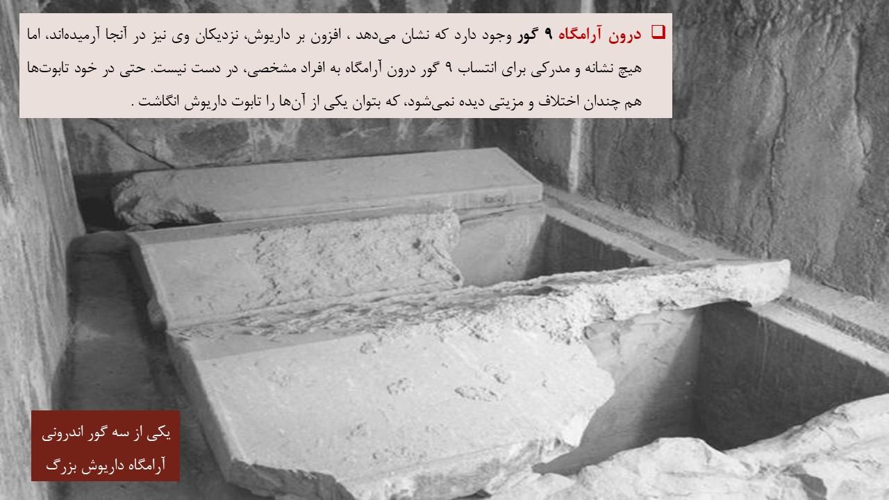 آرامگاه داریوش بزرگ در نقش رستم، دارای سه اتاقک است.  هر کدام از اتاقک‌ها دارای 3 گور سنگی است که در کنار یک‌دیگر قرار گرفته‌اند.  شواهد نشان‌ می‌دهد که این 9 گور، متعلق به داریوش و هشت نفر از نزدیکان وی است ، اما هویت هیچ‌کدام از گورها به ‌طور قطعی مشخص نیست و اکثرا بر پایه حدس و گمان است. در اتاقک روبه‌روی ورودی آرامگاه، یکی از گورها سرپوشی محدبی و ظاهری نسبتا ظریف‌تر از بقیه دارد که با توجه به تفاوت ظاهری قبر، احتمال می‌رود این گور متعلق به داریوش باشد.