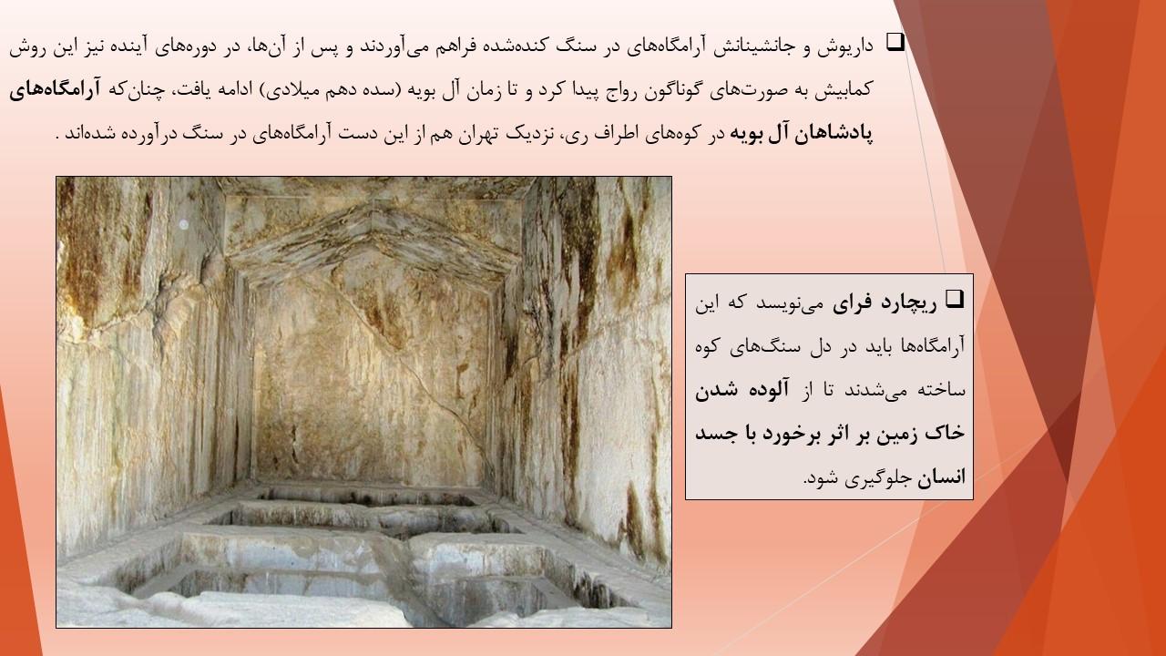داریوش و جانشینانش آرامگاه‌های در سنگ کنده‌شده فراهم می‌آوردند و پس از آن‌ها، در دوره‌های آینده نیز این روش کمابیش به صورت‌های گوناگون رواج پیدا کرد و تا زمان آل بویه (سده دهم میلادی) ادامه یافت، چنان‌که آرامگاه‌های پادشاهان آل بویه در کوه‌های اطراف ری، نزدیک تهران هم از این دست آرامگاه‌های در سنگ درآورده شده‌اند .