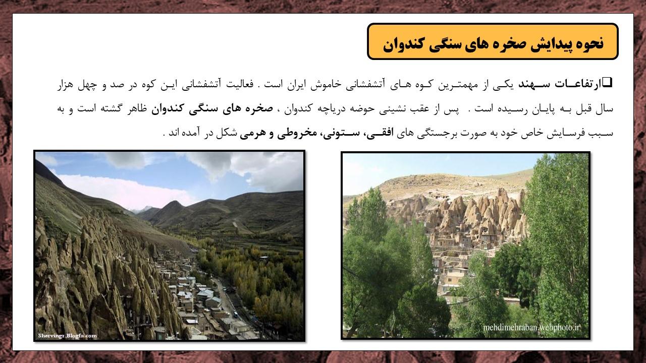 ارتفاعـات سـهند يكـي از مهمتـرين كـوه هـاي آتشفشاني خاموش ايران است . فعاليت آتشفشاني ايـن كوه در صد و چهل هزار سال قبل بـه پايـان رسـيده است . پس از عقب نشيني حوضه درياچه كندوان ، صخره هاي سنگي كندوان ظاهر گشته است و به سـبب فرسـايش خاص خود به صورت برجستگي هاي افقـي، سـتوني، مخروطي و هرمي شكل در آمده اند .