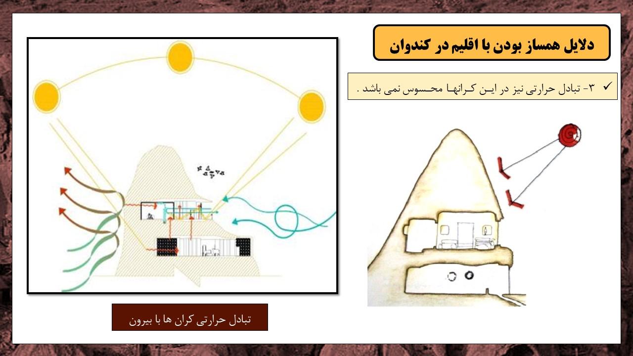 جهت قرارگيـري كـران هـا كـه اكثـراً رو بـه جنوب مي باشد و نحوه قرارگيـري كـران هـا در كنـار يكديگر موجب شكسته شدن باد مي گردد و قرارگيري در و پنجره ها در داخـل فـضاي ديـوار مـانع از ورود برف و باران به داخل كران ها مي شود . و ...