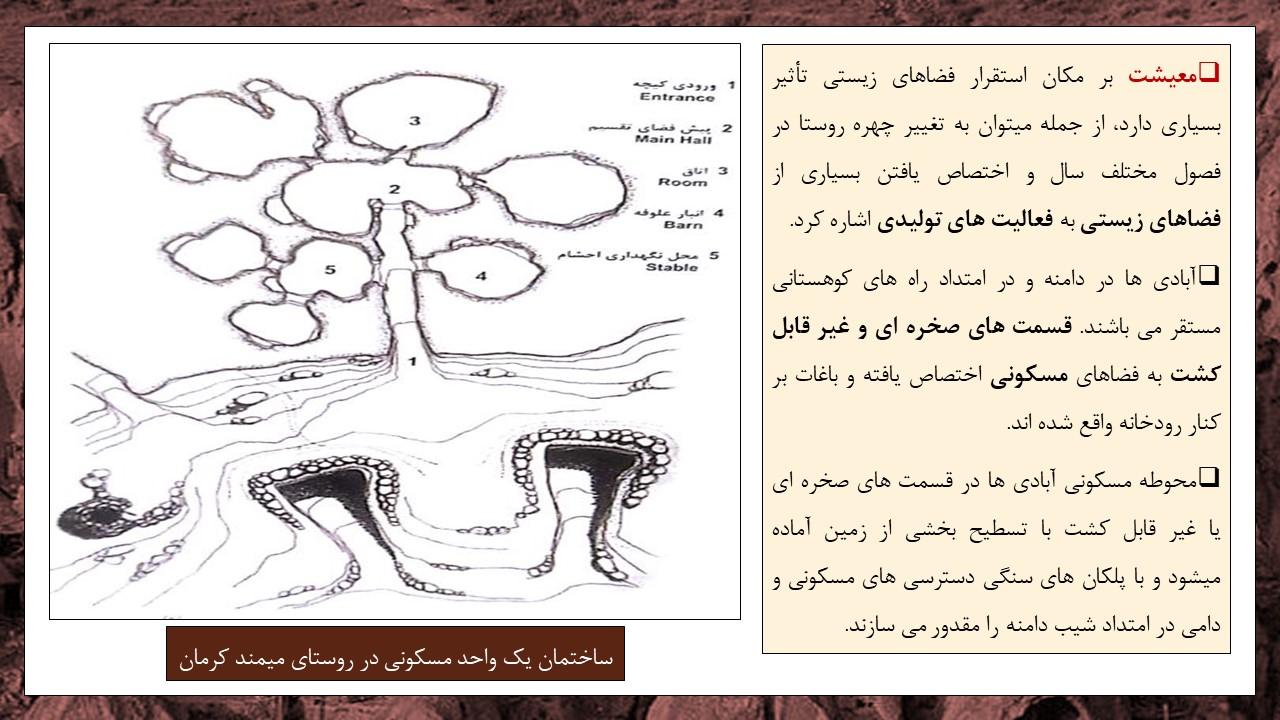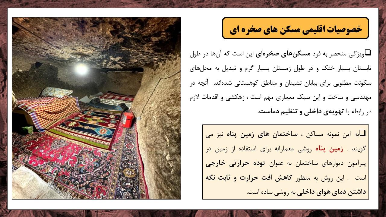 4 . در معماري صخرهاي جنبههاي دفاعي مساكن در مقابل هجوم انسانها، حيوانات و حوادث طبيعي بيش از ساير عوامل مد نظر است.