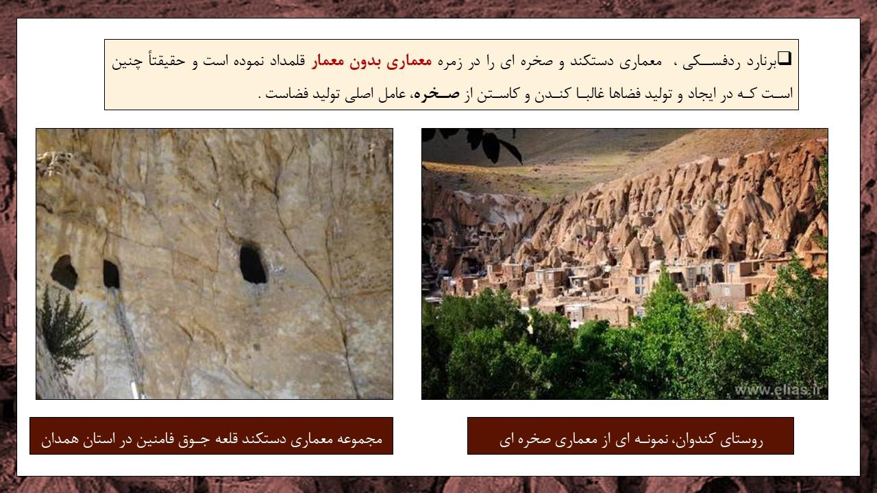 پس توضیحاتی پیرامون جاودانگی معماری صخره ای ، فلسفه آن و تاریخ پیدایش آن ارائه می گردد .