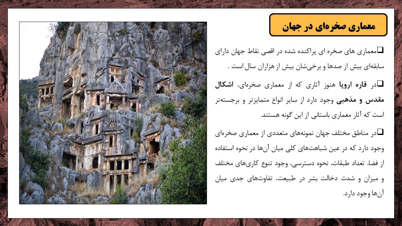در ادامه این بخش ، توضیحاتی همراه با تصاویر از معماری صخره ای در جهان ارائه شده و سپس مهم ترین ویژگی های معماری صخره ای بیان می گردد :