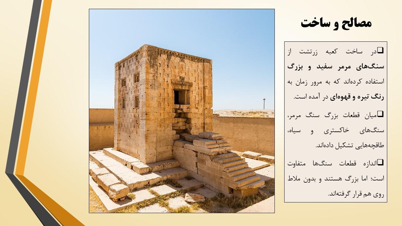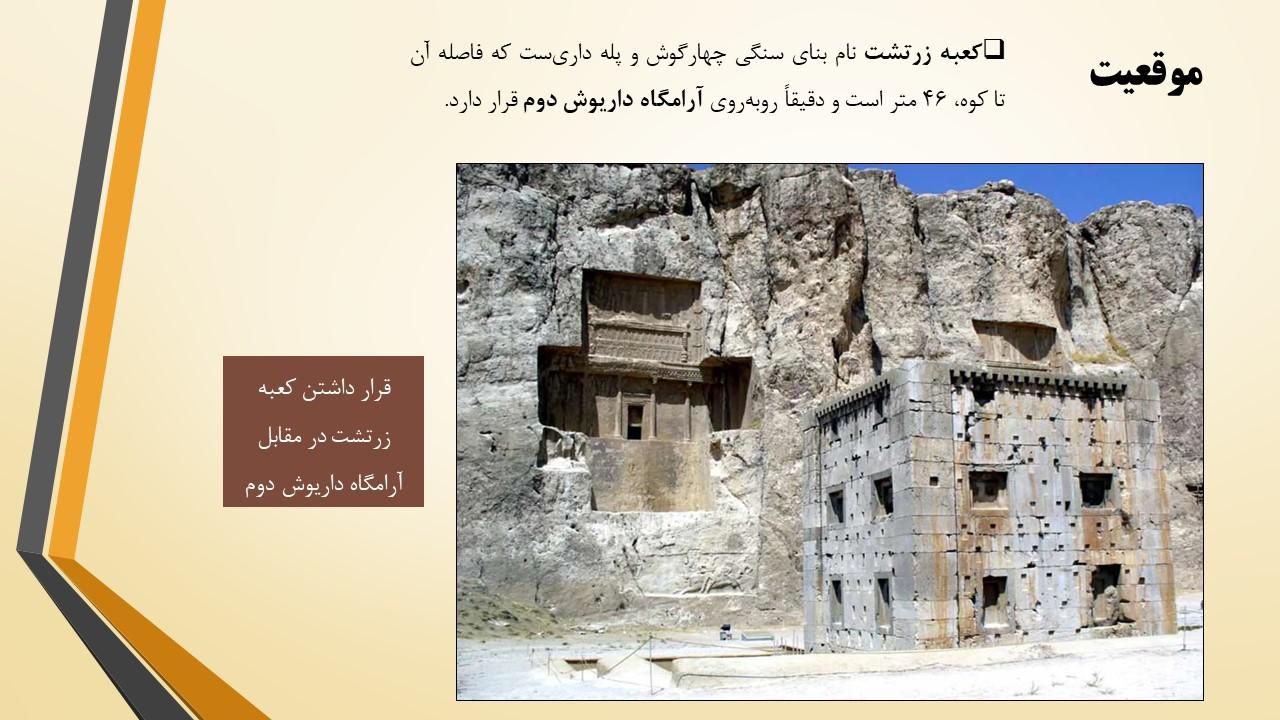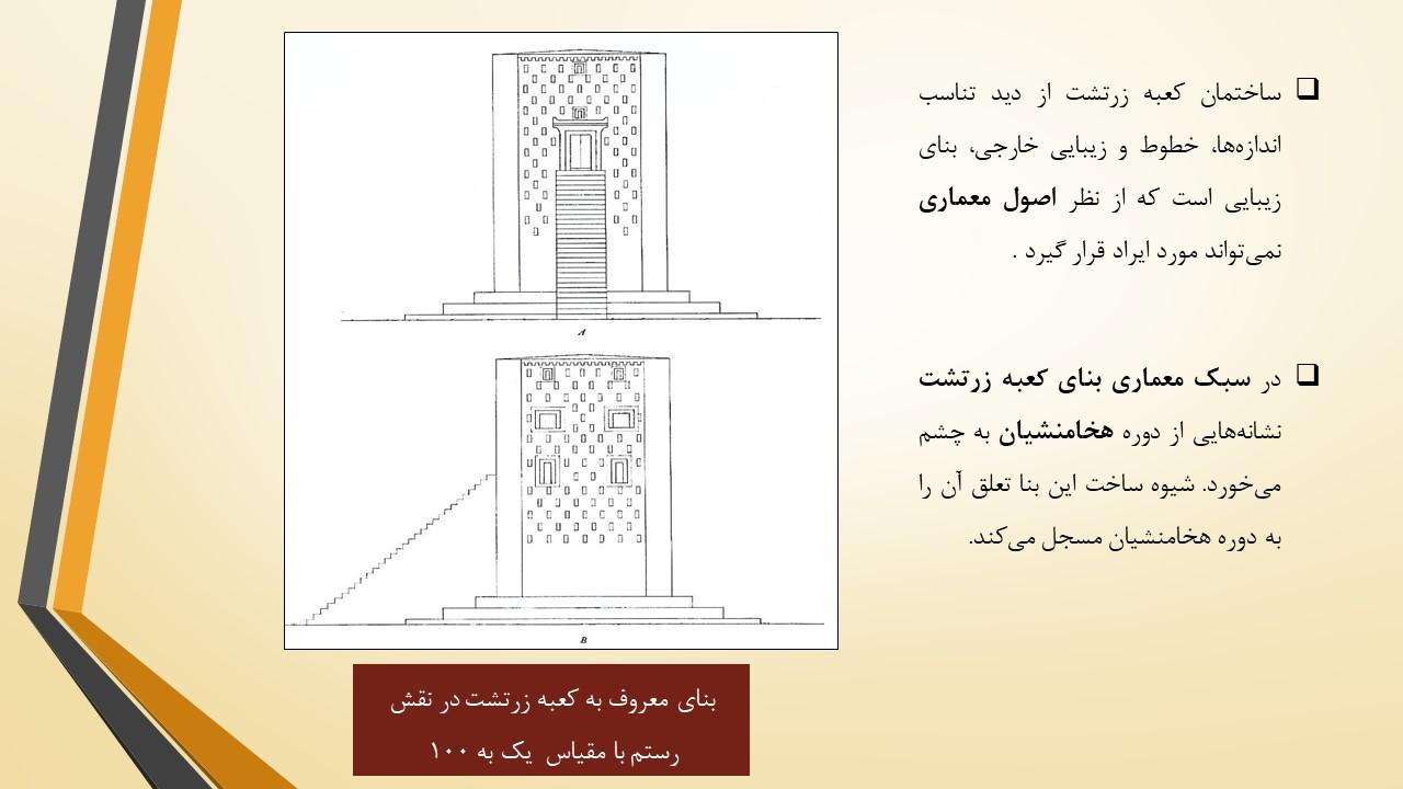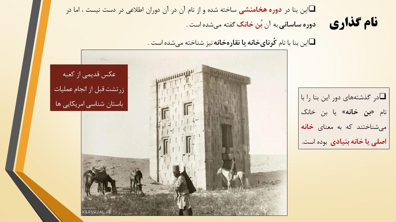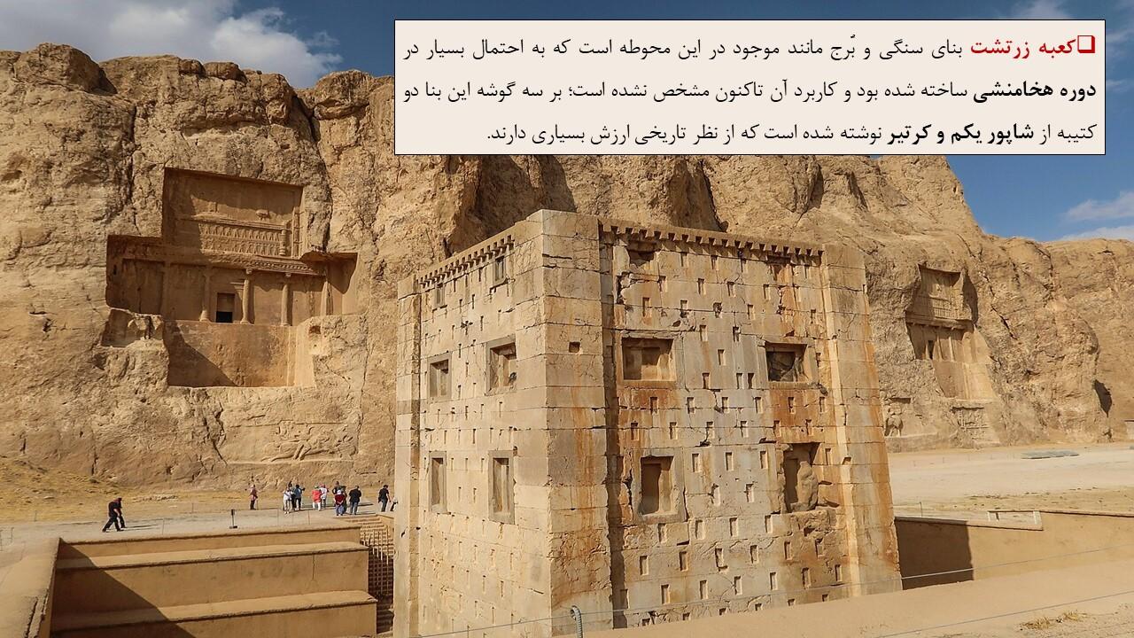در این مجموعه دو پاورپوینت در مورد بنای معروف به کعبه زرتشت قرار داده شده است که به طور کامل تمام ویژگی های این بنا را مورد بررسی قرار داده است ازجمله مسئله مربوط به نام گذاری این بنا با عنوان کعبه زرتشت و هم چنین فرضیه های مختلف درمورد کاربری این بنا و بیان استدلالات مختلف و بررسی و تحلیل آن ها .