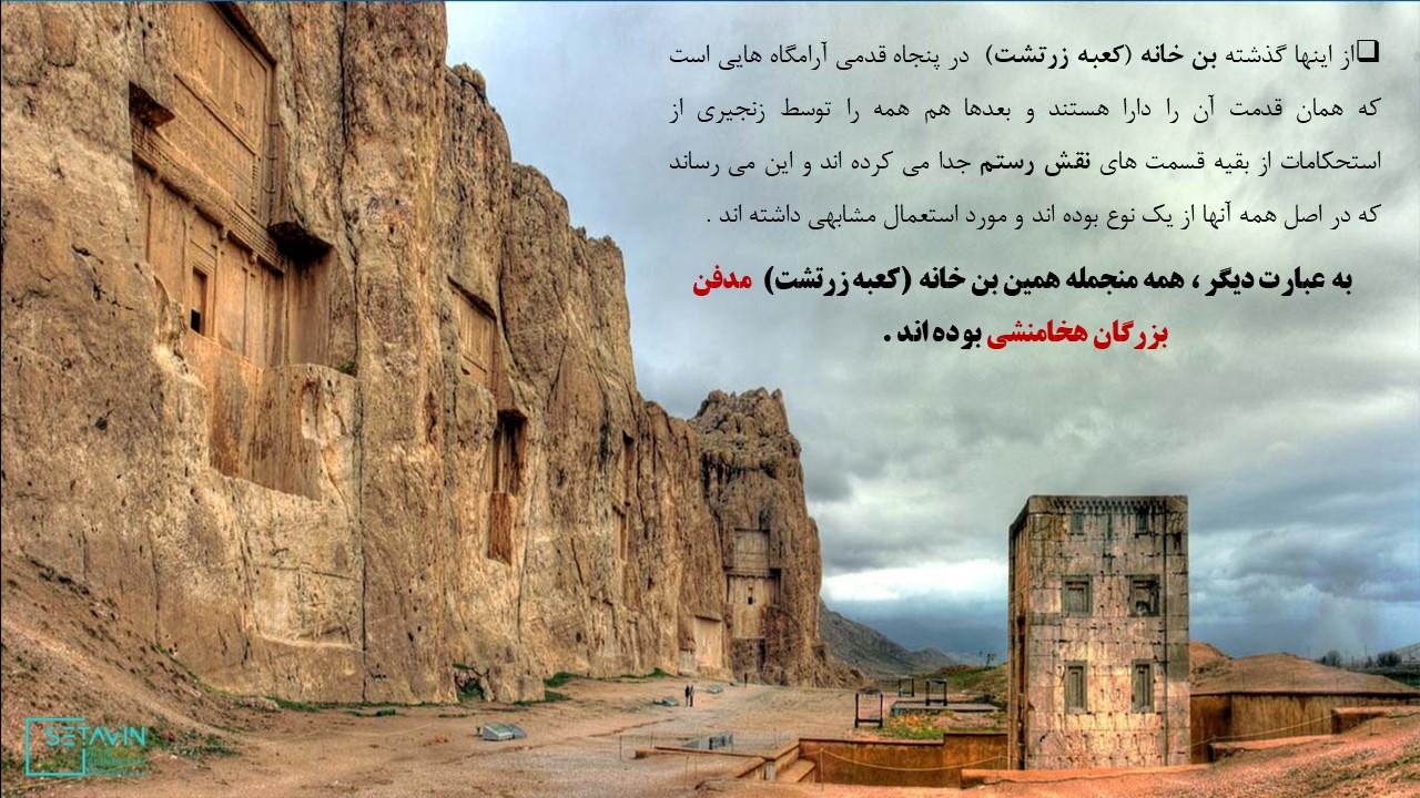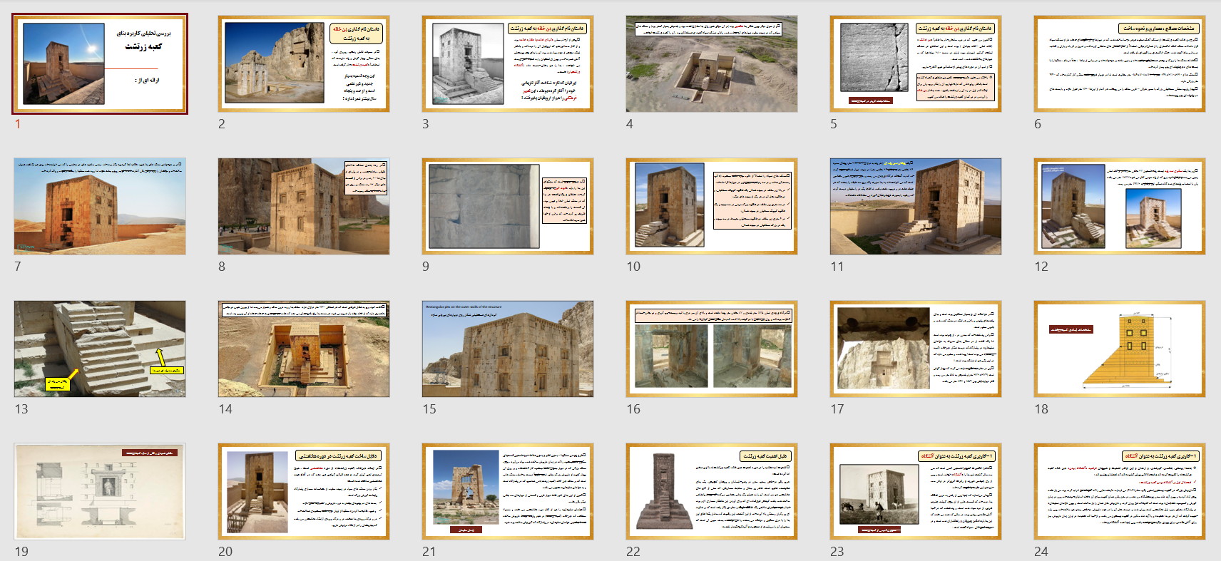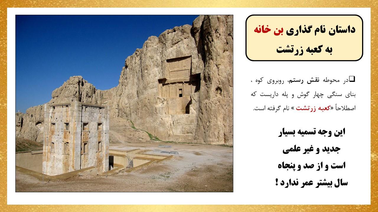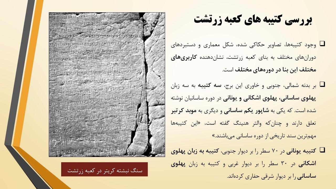در این مجموعه دو پاورپوینت در مورد بنای معروف به کعبه زرتشت قرار داده شده است که به طور کامل تمام ویژگی های این بنا را مورد بررسی قرار داده است ازجمله مسئله مربوط به نام گذاری این بنا با عنوان کعبه زرتشت و هم چنین فرضیه های مختلف درمورد کاربری این بنا و بیان استدلالات مختلف و بررسی و تحلیل آن ها .