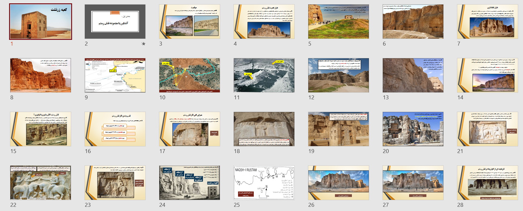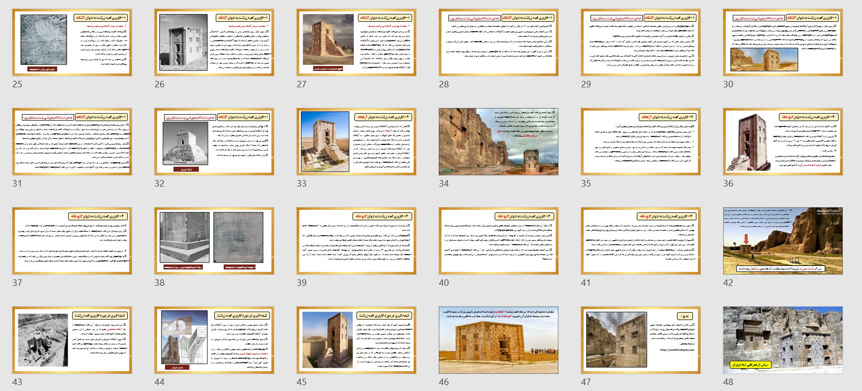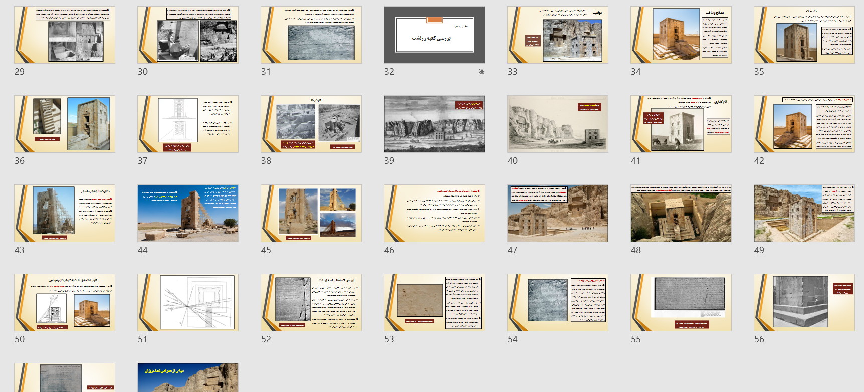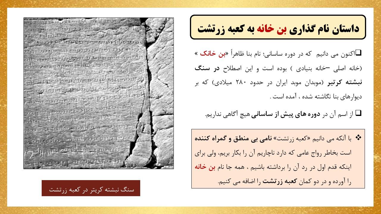 در این مجموعه دو پاورپوینت در مورد بنای معروف به کعبه زرتشت قرار داده شده است که به طور کامل تمام ویژگی های این بنا را مورد بررسی قرار داده است ازجمله مسئله مربوط به نام گذاری این بنا با عنوان کعبه زرتشت و هم چنین فرضیه های مختلف درمورد کاربری این بنا و بیان استدلالات مختلف و بررسی و تحلیل آن ها .