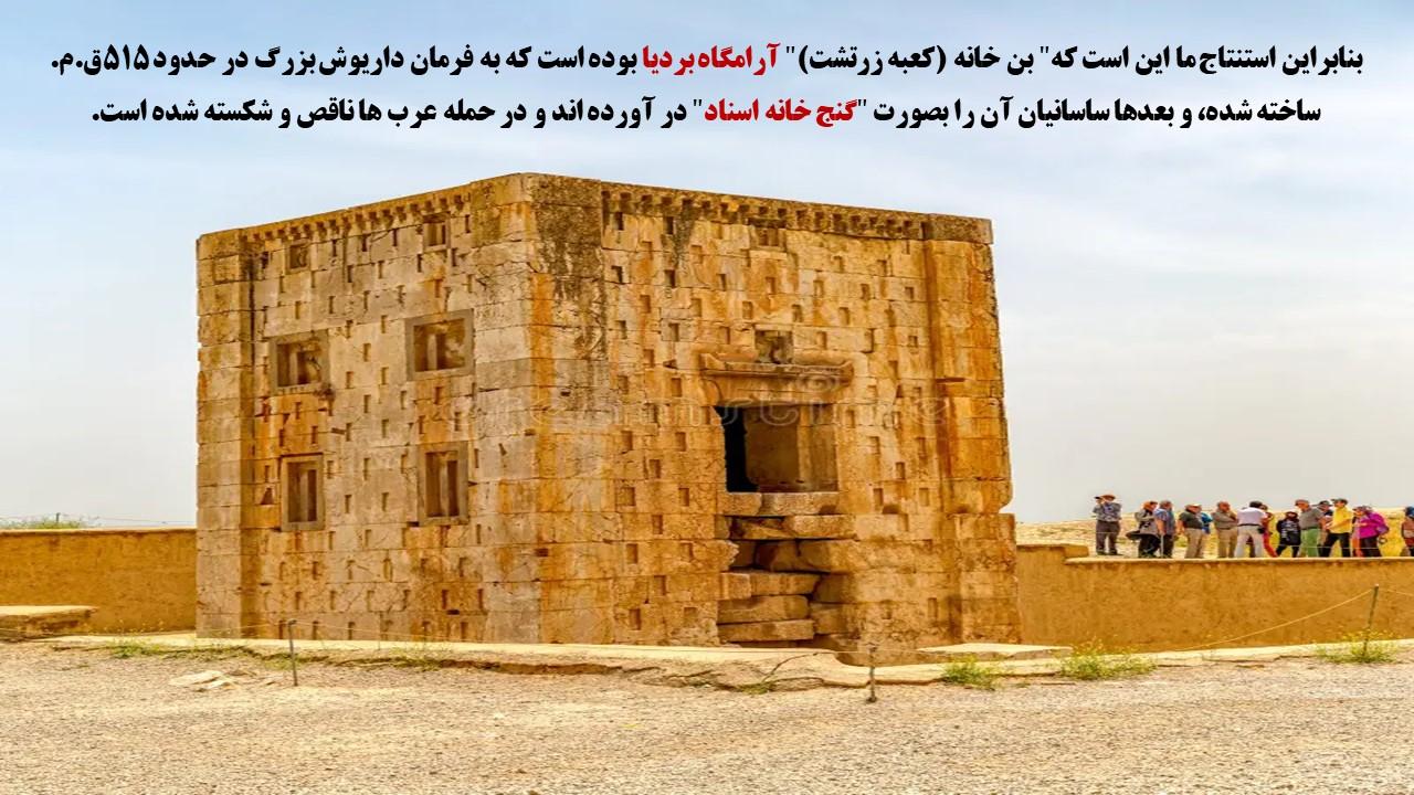بنابراین استنتاج ما این است که" بن خانه (کعبه زرتشت)" آرامگاه بردیا بوده است که به فرمان داریوش بزرگ در حدود 515ق.م. ساخته شده، و بعدها ساسانیان آن را بصورت "گنج خانه اسناد" در آورده اند و در حمله عرب ها ناقص و شکسته شده است.