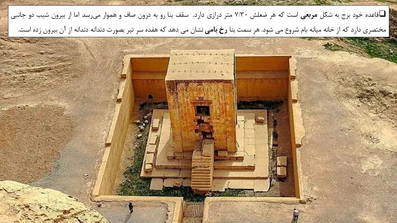 قاعده خود برج به شکل مربعی است که هر ضعلش 7/30 متر درازی دارد. سقف بنا رو به درون صاف و هموار میرسد اما از بیرون شیب دو جانبی مختصری دارد که از خانه میانه بام شروع می شود. هر سمت بنا رخ بامی نشان می دهد که هفده سر تیر بصورت دندانه دندانه از آن بیرون زده است.
