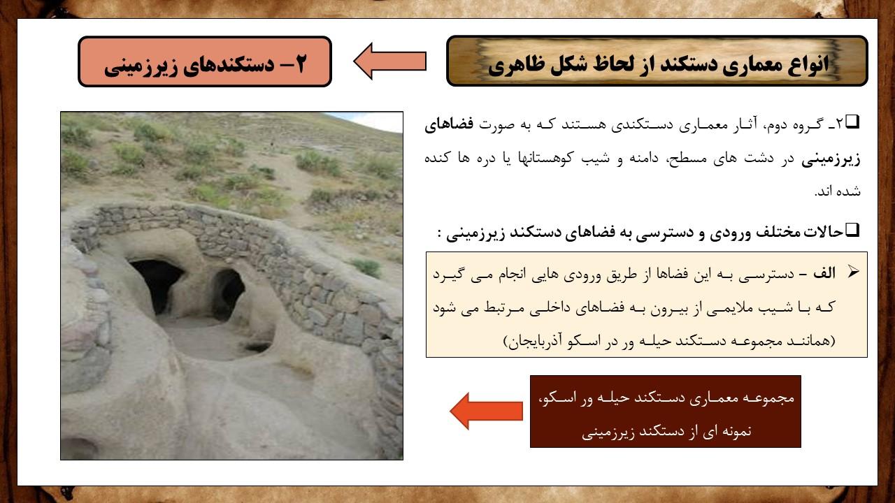 2ـ گـروه دوم، آثـار معمـاري دسـتکندي هسـتند کـه به صورت فضاهاي زیرزمینی در دشت هاي مسطح، دامنه و شیب کوهستانها یا دره ها کنده شده اند.