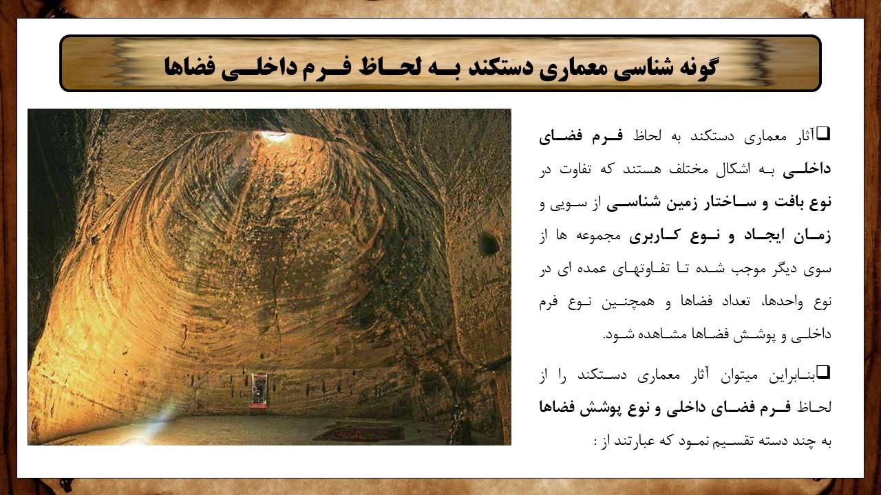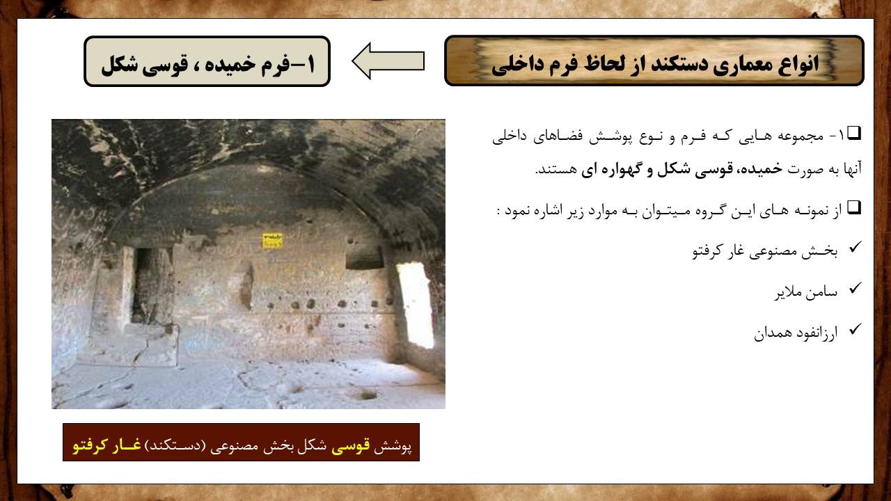 - گونه شناسی معماري دستکند بـه لحـاظ فـرم داخلـی فضاها :