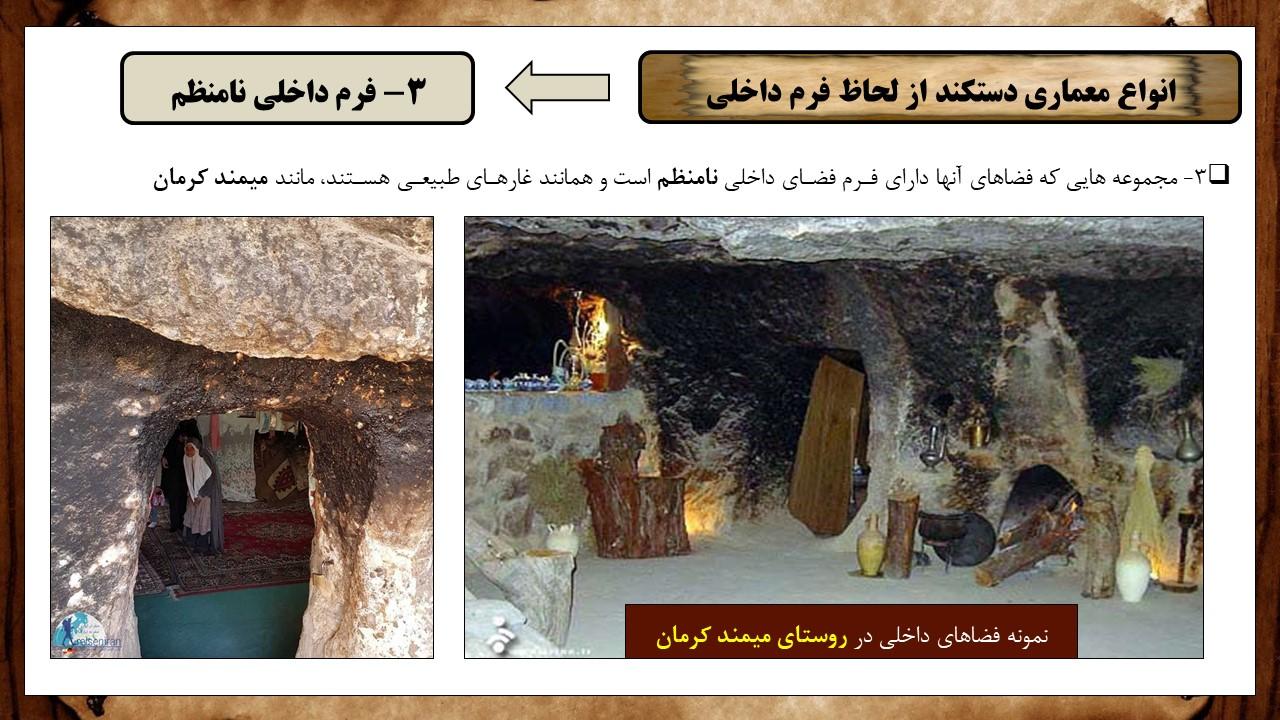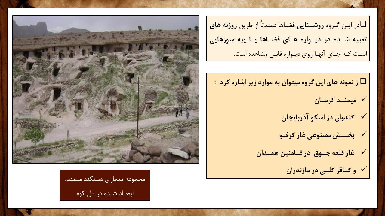 3- مجموعه هایی که فضاهاي آنها داراي فـرم فضـاي داخلی نامنظم است و همانند غارهـاي طبیعـی هسـتند، مانند میمند کرمان