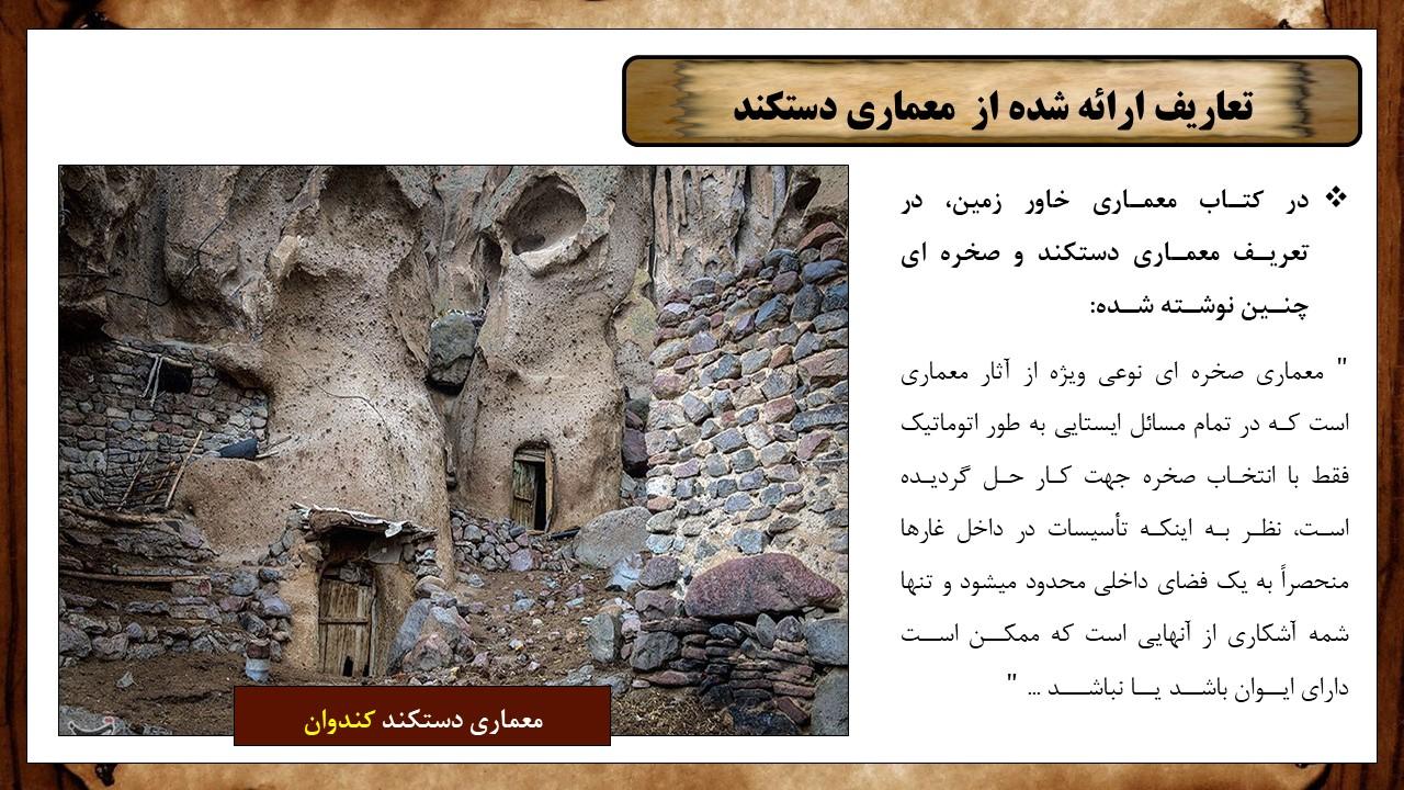 منبع اصلی تهیه این پاورپوینت کامل و جامع ، فایل پی دی اف مقاله ای است با عنوان " مطالعه و بررسی معماری دستکند ایران " نوشته یعقوب محمدی فر و اسماعیل همتی که فایل پی دی اف مقاله نیز همراه با پاورپوینت برای دانلود قرار داده شده است .