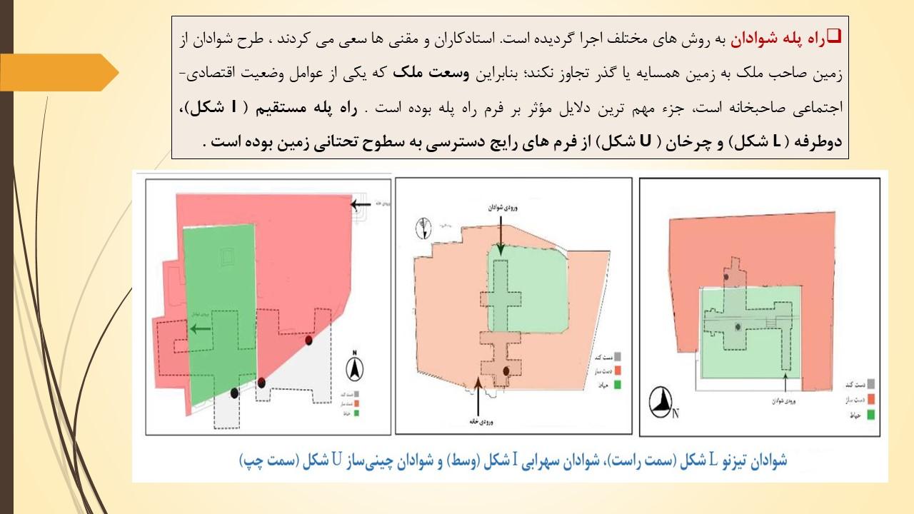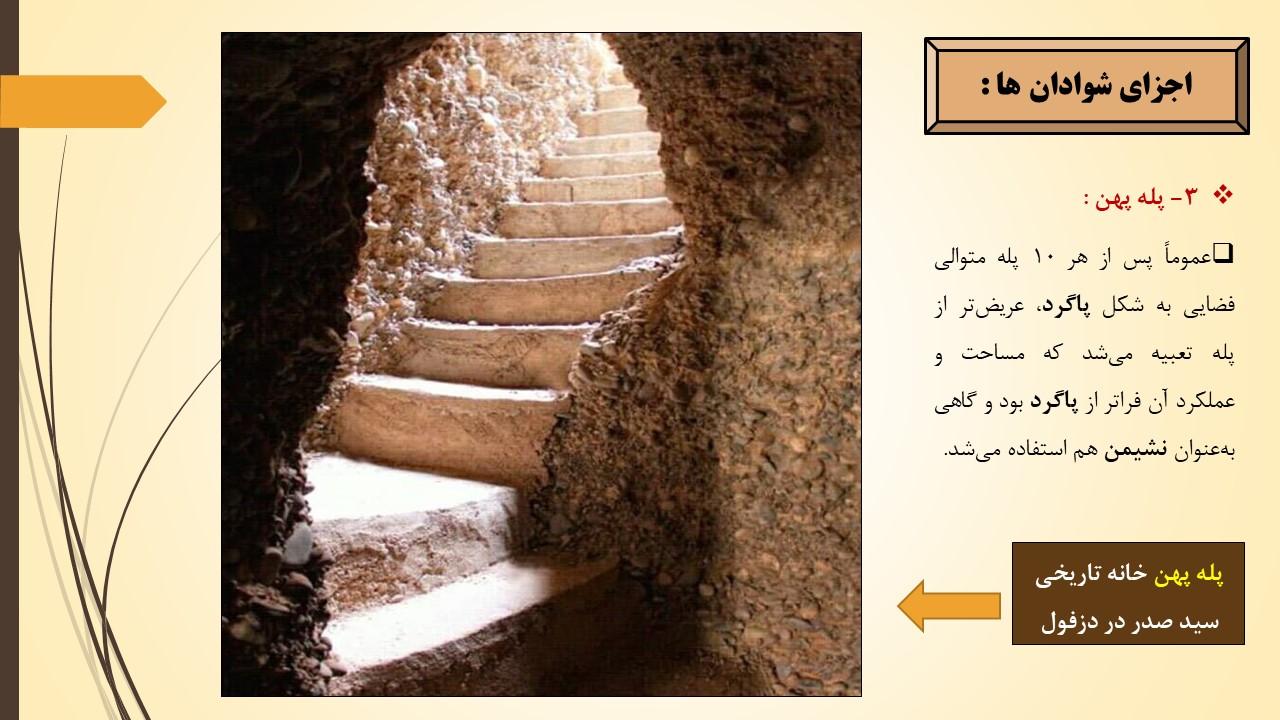 پلکان ورودی شوادانها عموماً از حیاط شروع و به صورت مستقیم به سمت پایین با تعداد زیادی پله که گاهی به ۱۲۰ هم میرسید، به صورت یکپارچه به صحن شوادان متصل میشد. شیب و ارتفاع پلهها با استانداردهای معمول امروزی متفاوت است .