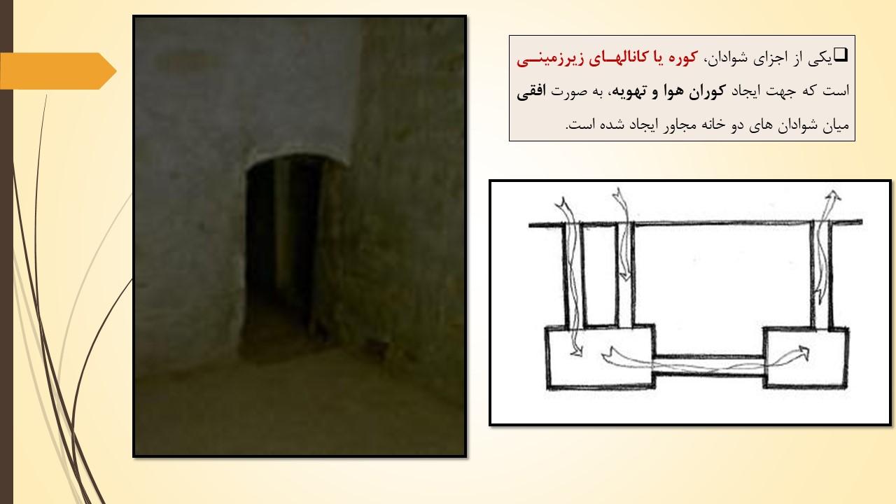 یکی از اجزای شوادان، کوره یا کانالهای زیرزمینی است که جهت ایجاد کوران هوا و تهویه، به صورت افقی میان شوادان های دو خانه مجاور ایجاد شده است.