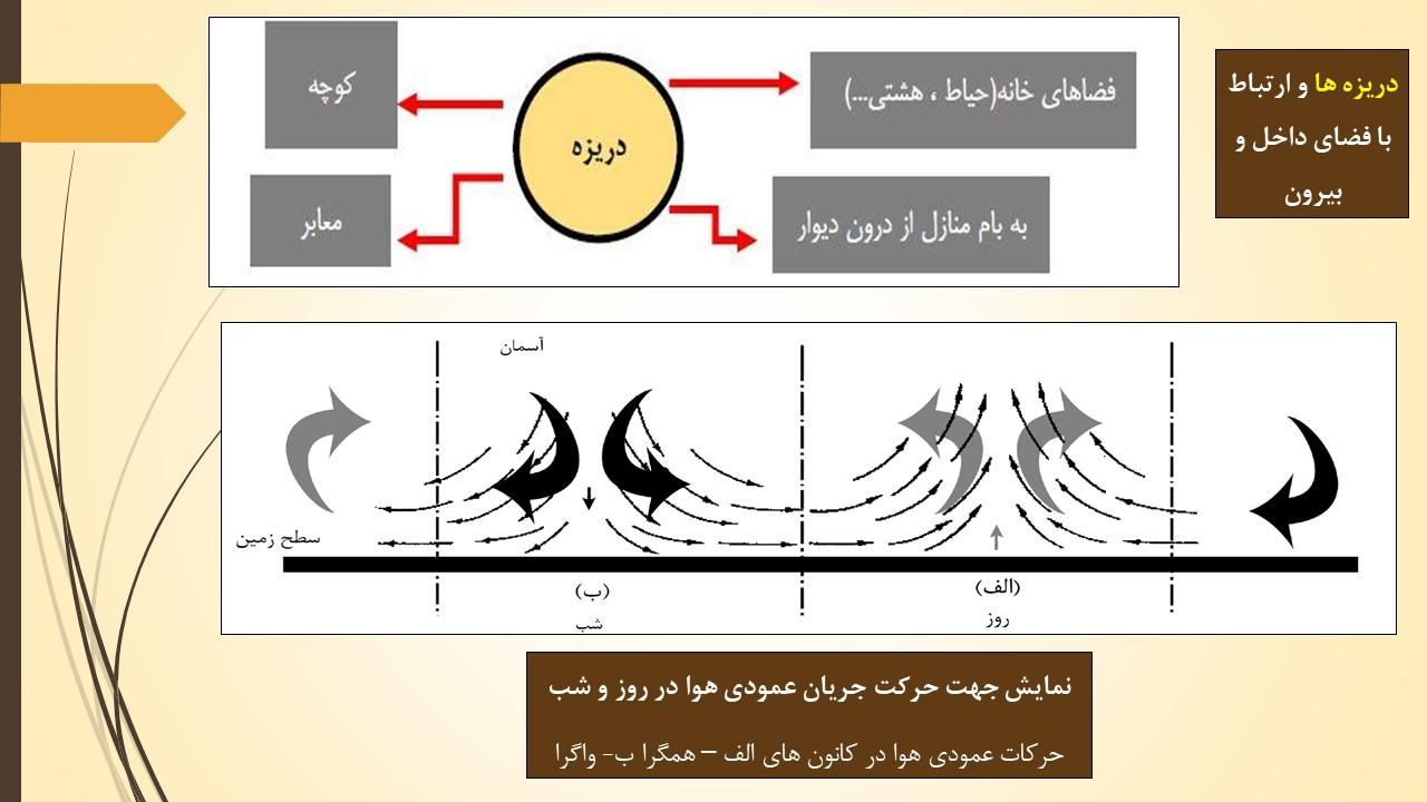 دریزه، روزنه ای استوانه ای به قطر حدود 1متر جهت تأمین نور و تهویه شوادان بوده است. این کانال فضاهای خانه را به شوادان مرتبط می کرده و باعث انتقال جریان هوای خنك از شوادان به فضاهای خانه می شده است.