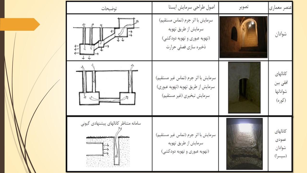 در شوادان ها از سرمایش به وسیله اثر جرم زمین، تهویه عبوری و تهویه دودکشی استفاده شده است. دریافت هوای تازه و ایجاد تهویه عبوری با استفاده از کانال های افقی متصل به فضای خارج صورت گرفته است.