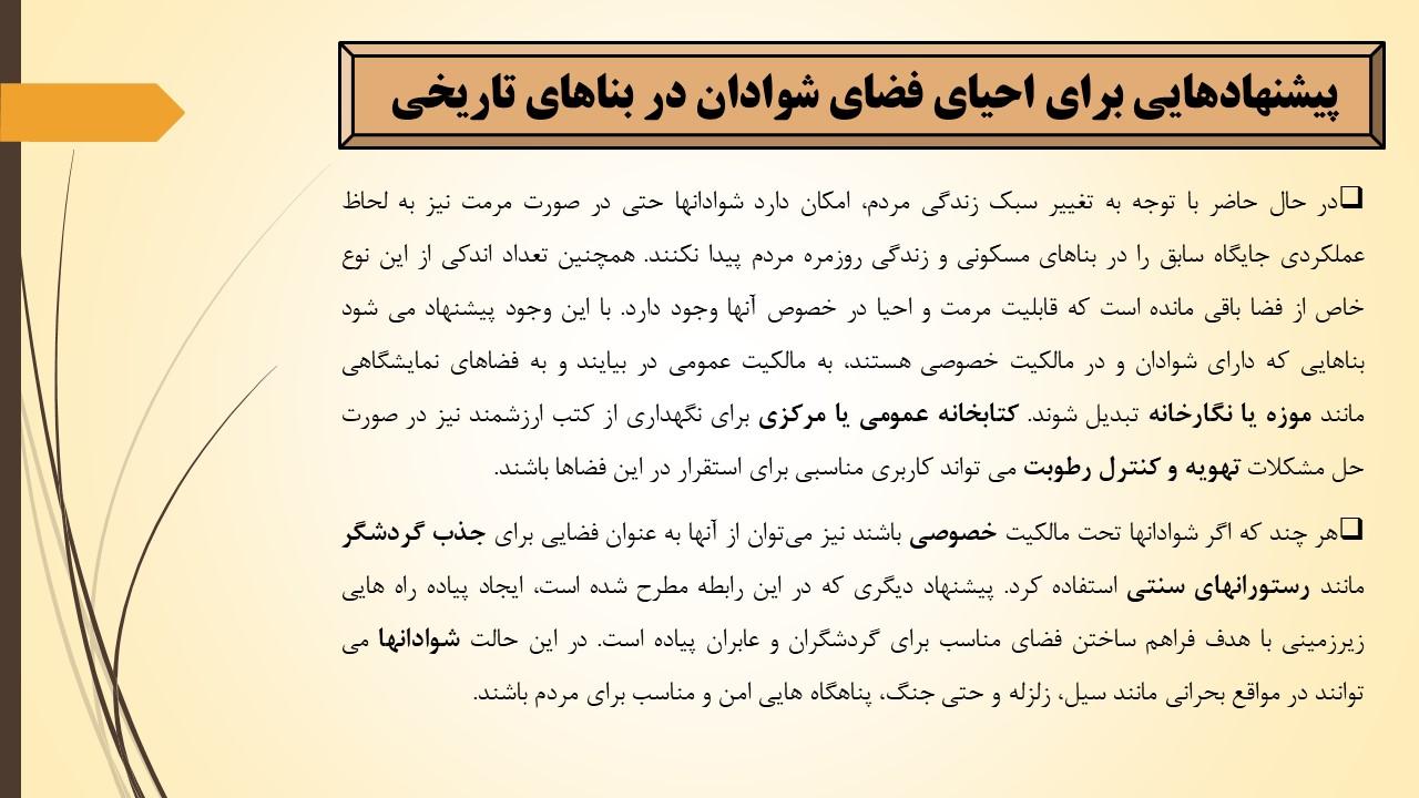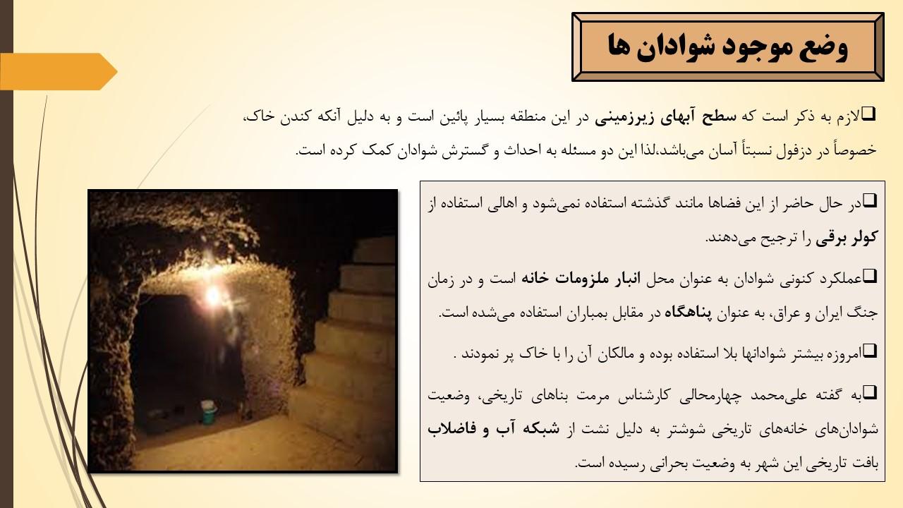 شوادانها یکی از گونه های منحصر به فرد معماری زیرزمینی و دستکند منطقه جنوب غرب ایران به شمار می روند که در حال حاضر به دلیل کم توجهی متروکه شده اند و در معرض تخریب قرار دارند. این فضا نمونه ای حاضر و در دسترس از معماری پایدار در گذشته و معماری بومی ایران است که می تواند الگویی مناسب برای طراحی اقلیمی در راستای تنظیم شرایط محیطی در دوره کنونی مورد استفاده قرار گیرد.