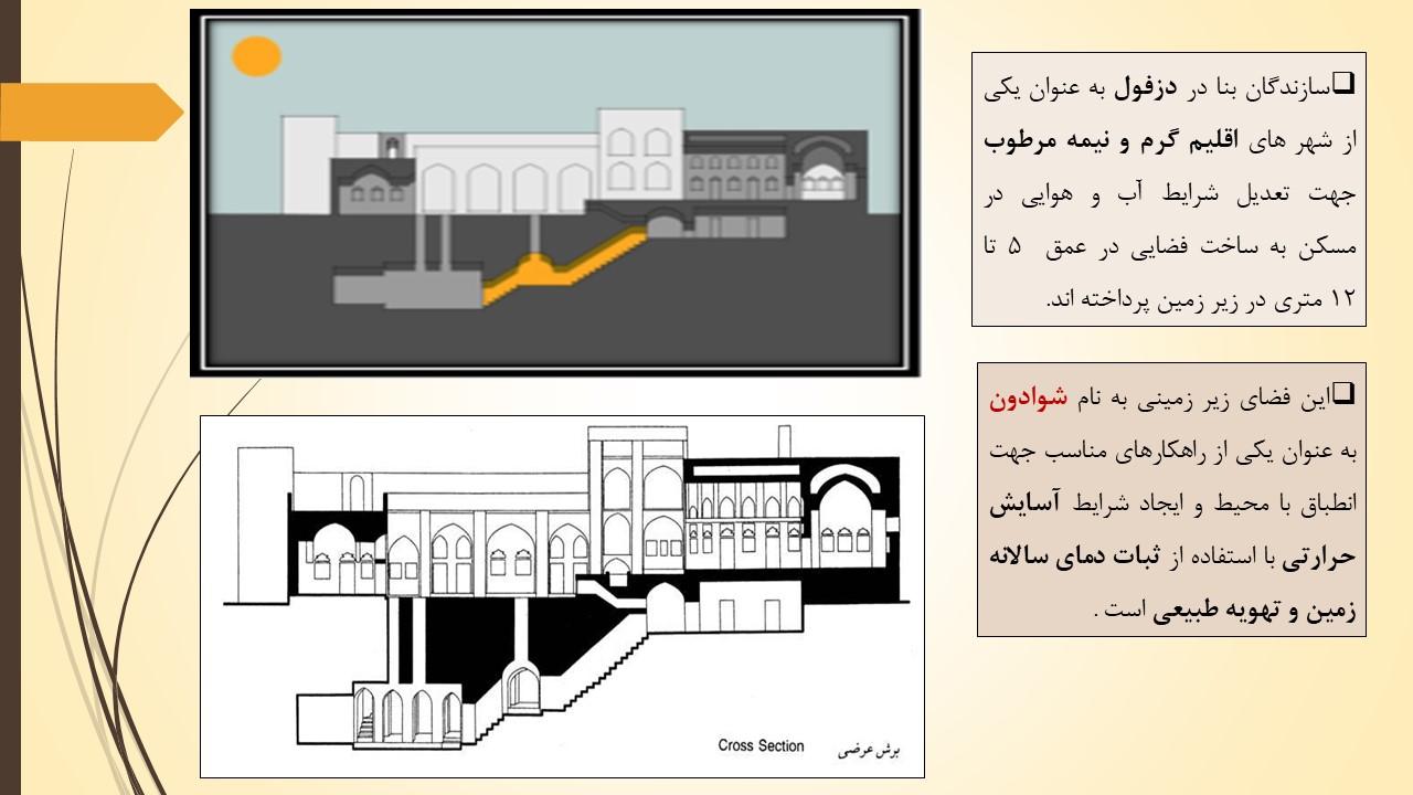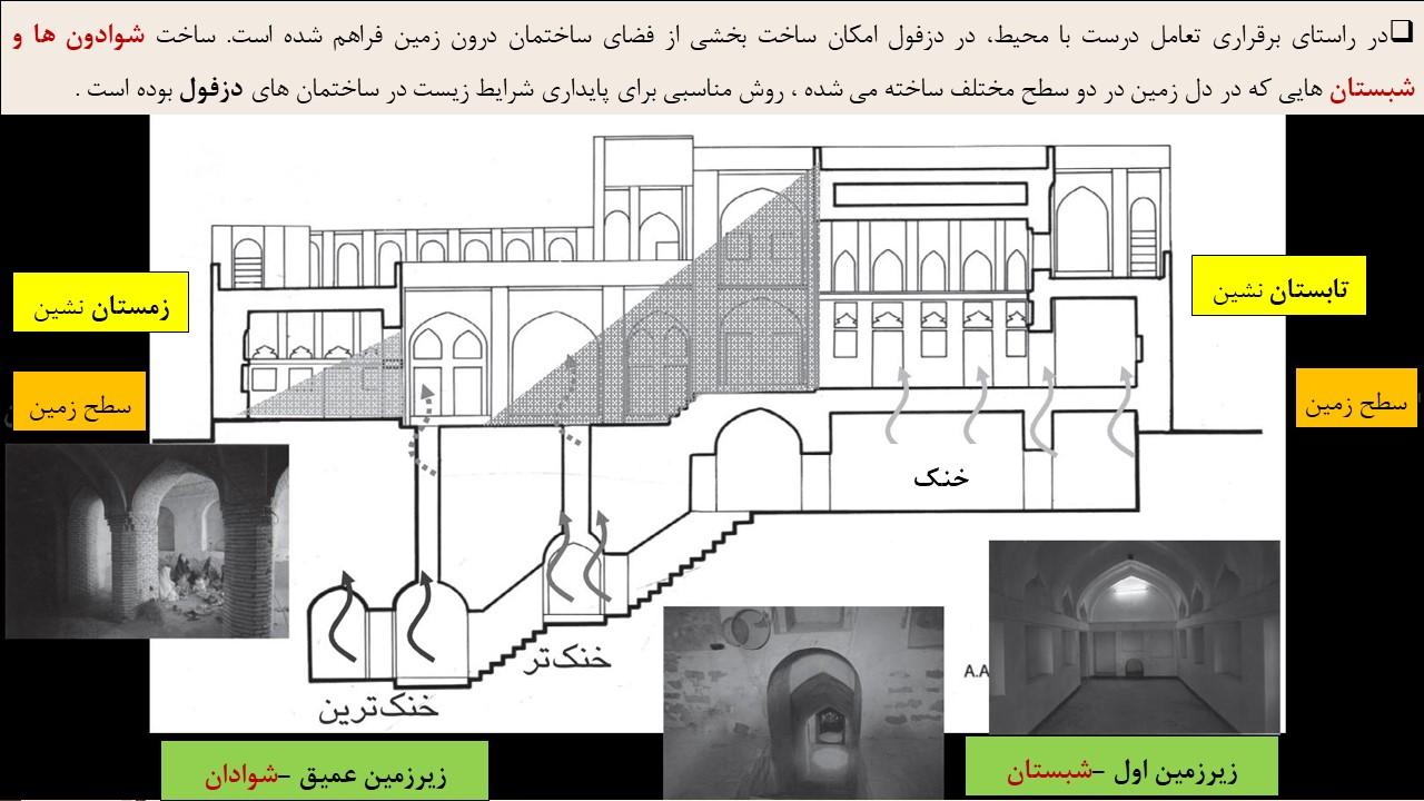 در راستای برقراری تعامل درست با محیط، در دزفول امکان ساخت بخشی از فضای ساختمان درون زمین فراهم شده است. ساخت شوادون ها و شبستان هایی که در دل زمین در دو سطح مختلف ساخته می شده ، روش مناسبی برای پایداری شرایط زیست در ساختمان های دزفول بوده است .