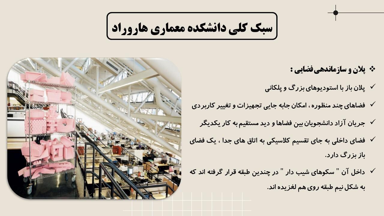 • جریان آزاد دانشجویان بین فضاها و دید مستقیم به کار یکدیگر