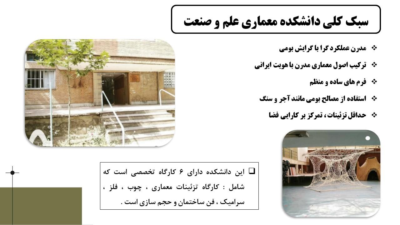 -در مقابل ، دانشکده معماری و شهرسازی علم و صنعت بیشتر به معماری مدرن نزدیک است تا معماری تاریخی تزئینی