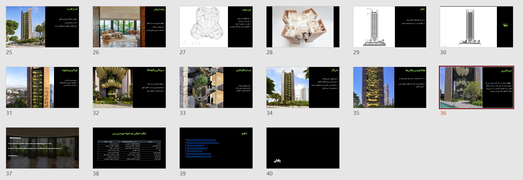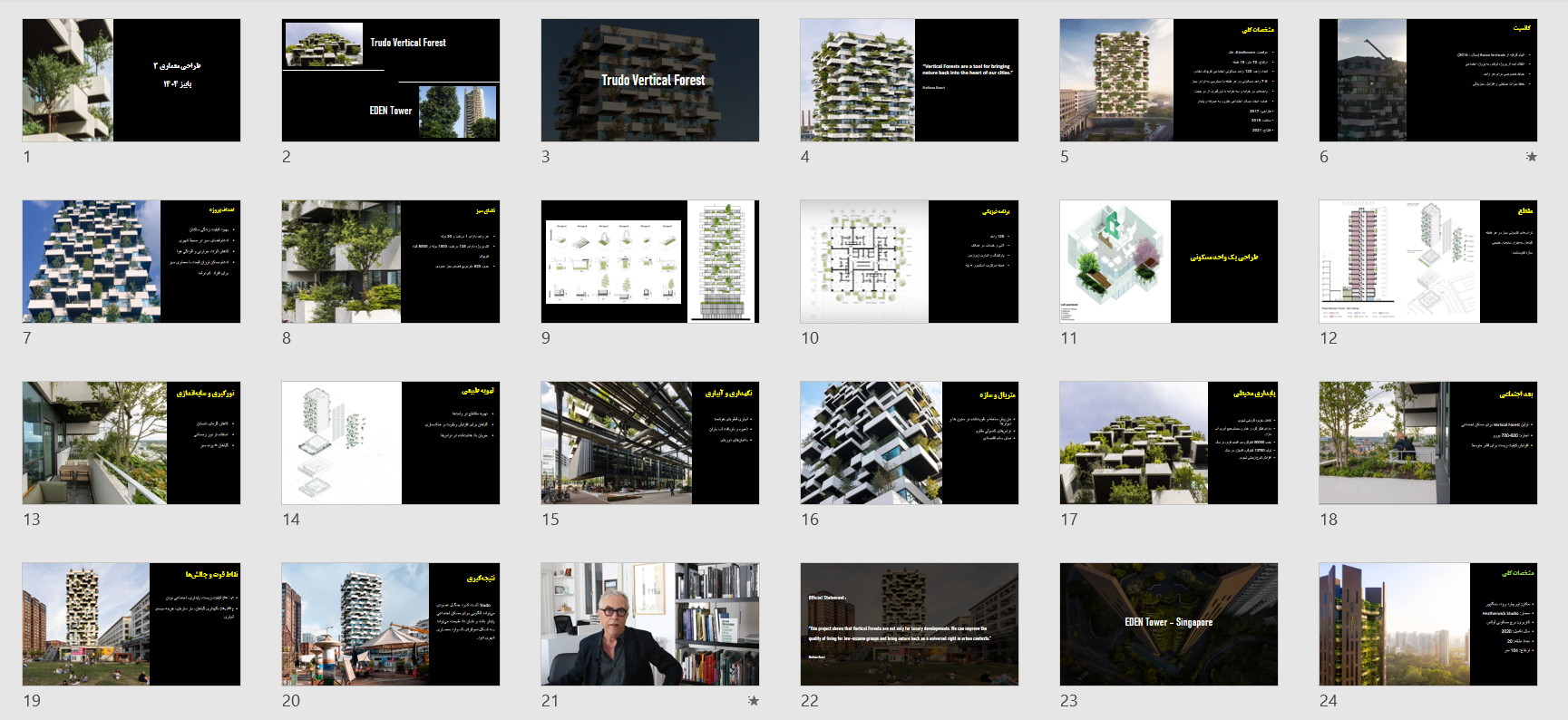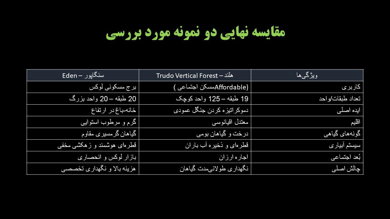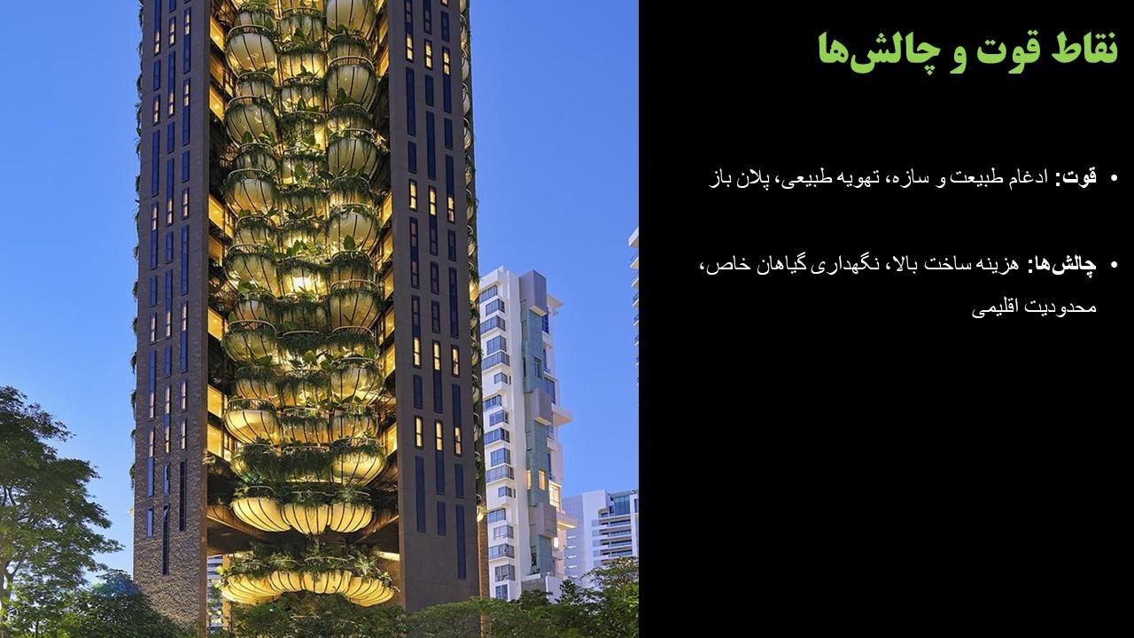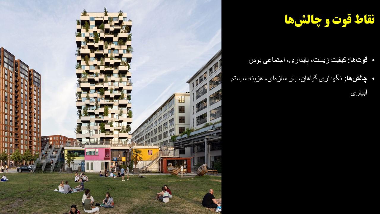 - برج Eden  نمونه‌ای است که نشان می‌دهد برج باغ می‌تواند هم یک اثر هنری باشد و هم یک راهکار اقلیمی برای شهرهای گرمسیری. در این پروژه، گیاهان نه الحاقی، بلکه بخشی از معماری‌اند.